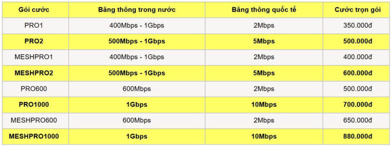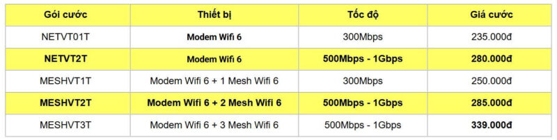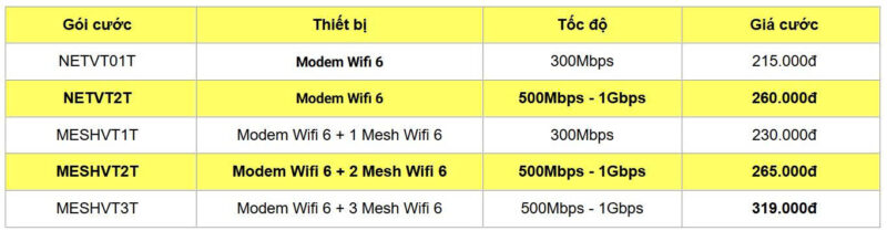 | Các gói cước được trang bị thiết bị đầu cuối công nghệ Wifi 6 (gói cước MESHPRO1 được trang bị thêm 01 thiết bị mesh wifi và các gói cước MESHPRO2, MESHPRO600, MESHPRO1000 được trang bị thêm 02 thiết bị mesh wifi để khách hàng có thể mở rộng vùng phủ sóng wifi) |